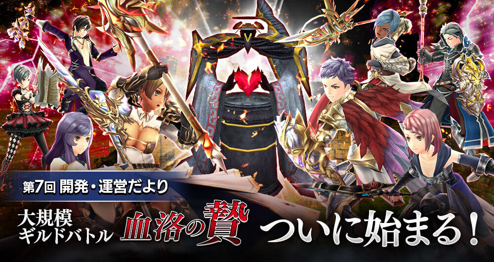 そして、大規模ギルドバトル「血洛の贄(けつらくのにえ)」について。本コンテンツの実装により、皆さんにぜひともお届けしたかった、究極のマルチプレイ、多人数 VS 多人数の面白さを提供したいと考えています。今まで手塩にかけて育てたキャラクターを最大限活用し、ギルドの皆さんと力をあわせて勝利を勝ち取っていただきたい!