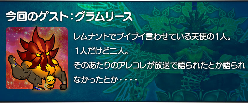 毎回、ミストの有名人をゲストに招いて、レムナント一の色男ことティリオン様が、お話を聞いていっちゃおう!っていう主旨ですからぁ、特にレディーのみなさんはお聴き逃しなく〜!