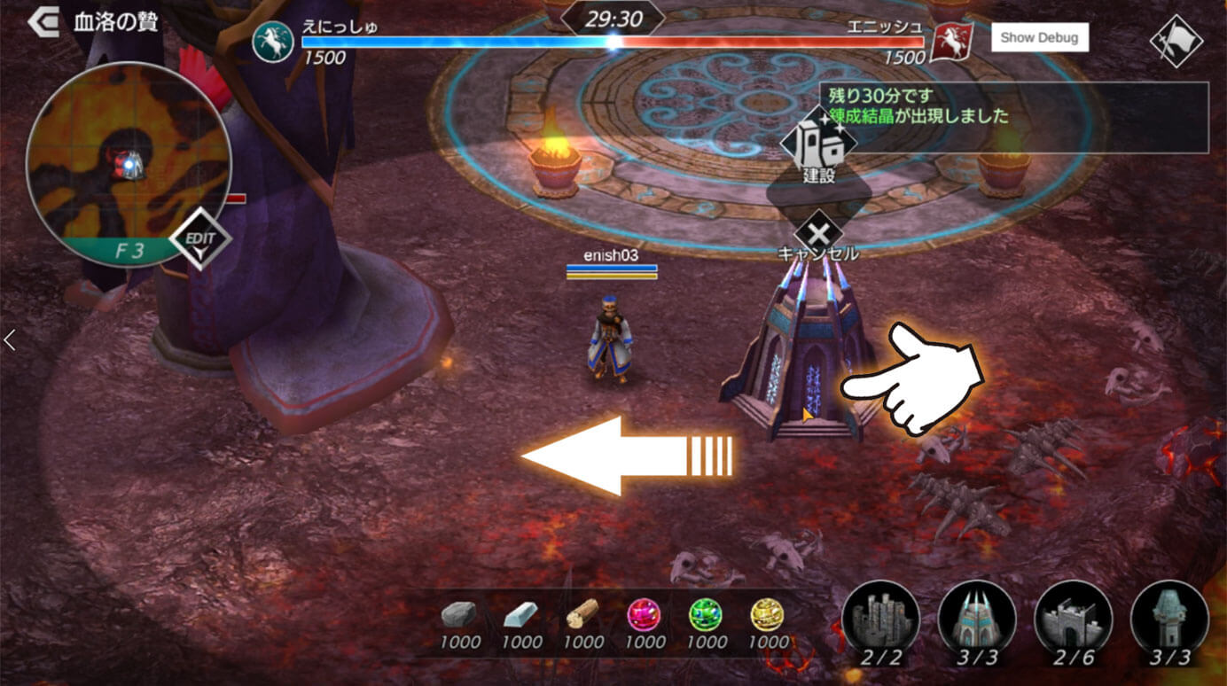 建設可能な施設数などの表示します、建築素材が満たされていない場合は対象をタップする事で必要数が表示されます |