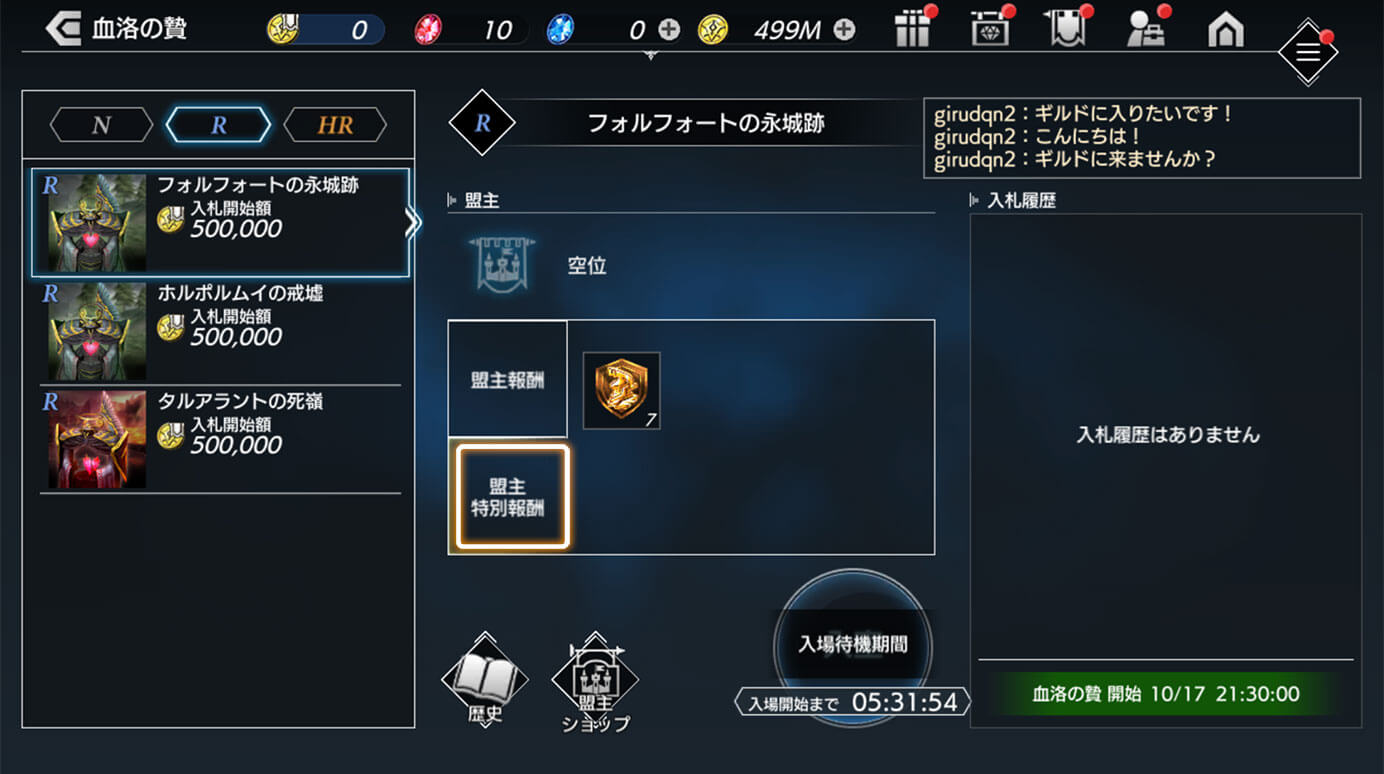 盟主のいる血洛 | 入札額が最も高いギルドが落札し、盟主ギルドと対戦 |